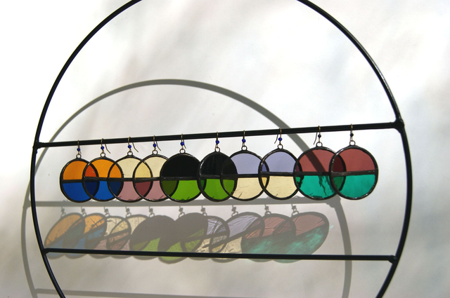 Boucles d'oreilles pendantes rondes Bicolores. Réalisées avec du vitrail, technique du vitrail Tiffany avec soudures à l'étain.