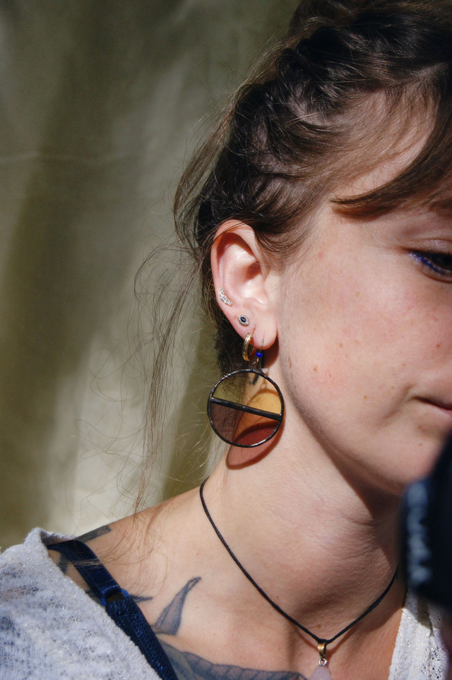 Le verre employé provient de chutes récupérées en atelier ; la fabrique de ces boucles est dans un esprit d'upcycling.