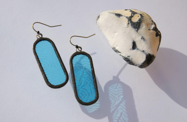 Boucles d'oreilles pendantes ovales, forme cartouche égyptienne. Bijoux fait-main, technique du vitrail Tiffany.