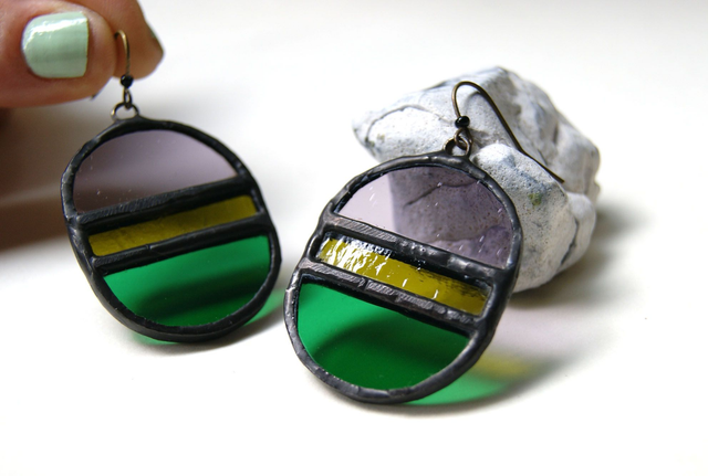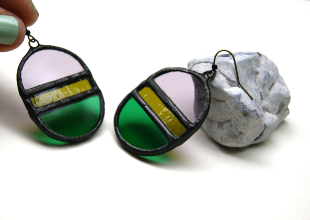 Paire de boucles d'oreilles en verre coloré, verre à motifs. fait-main sur Toulouse, France; Modèle tricolore. Technique du vitrail Tiffany moderne. Soudures à l'étain. Crochets boucles sans nickel.