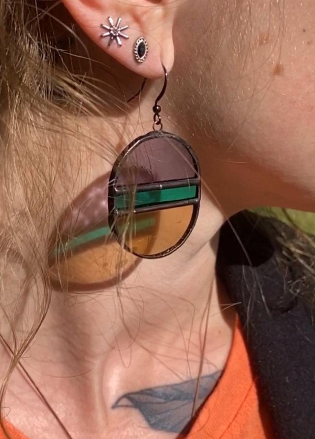 Matériaux : Cuivre, Étain, Verre Le verre employé provient de chutes récupérées en atelier; la fabrique de ces boucles est dans un esprit d'upcycling.