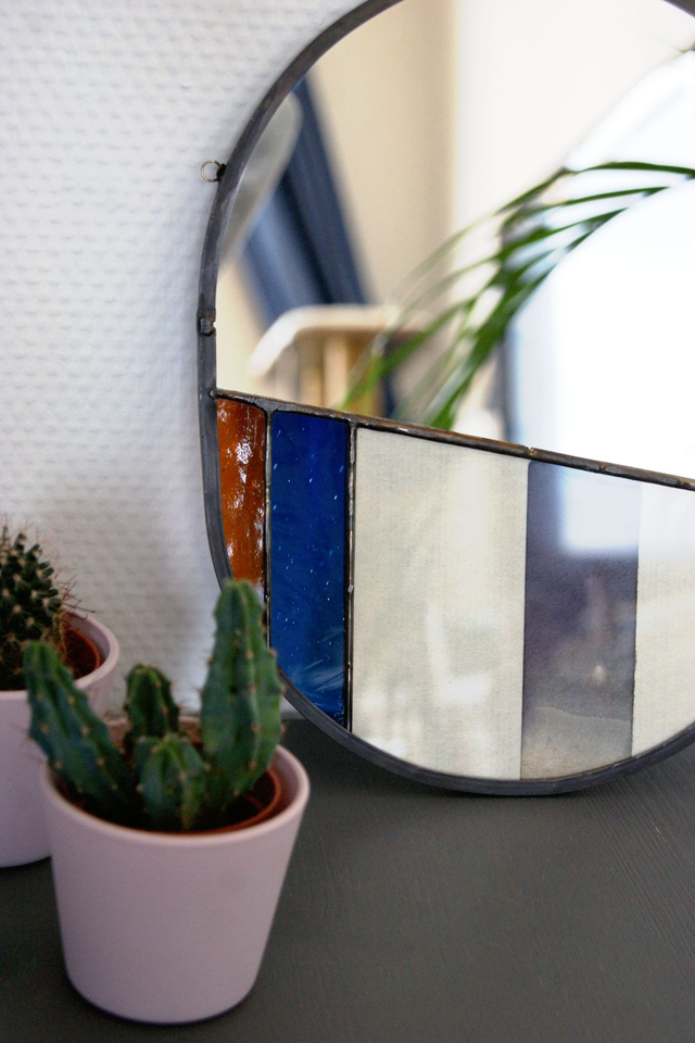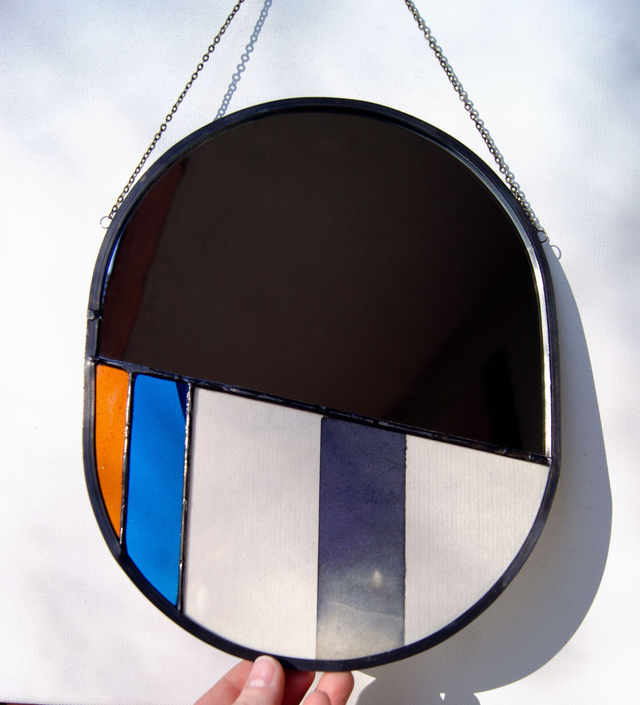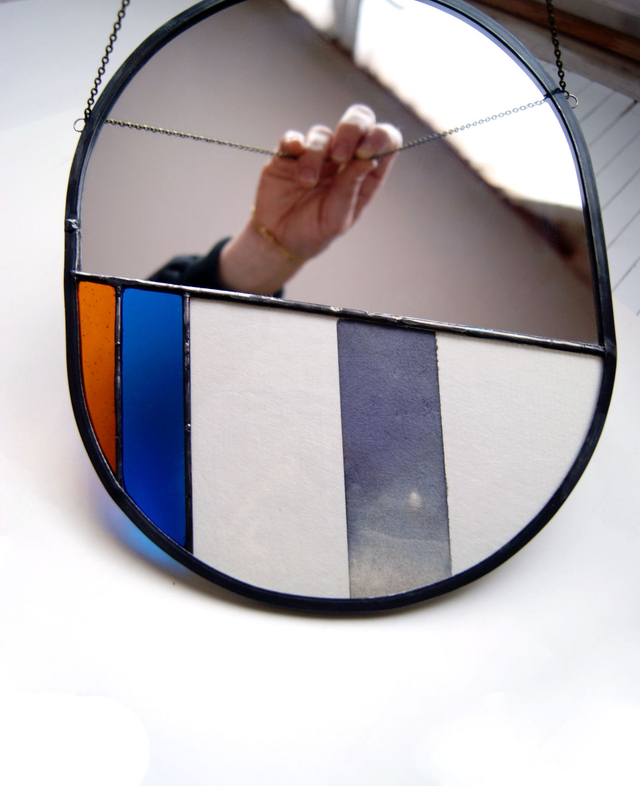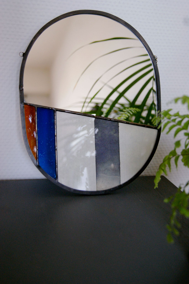 Miroir série Origine, Grand format . La pièce est réalisée avec la technique du vitrail Tiffany. Assemblé au cuivre et soudé à l'étain. La technique de la teinture végétale est également incorporé dans le processus.