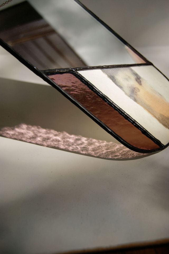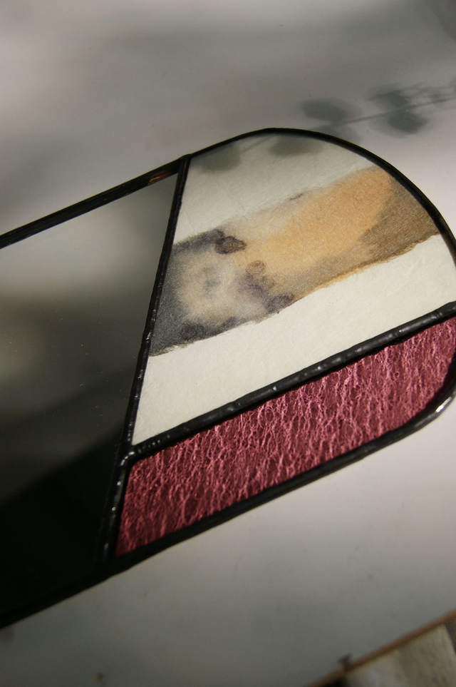 Miroir de la série Origine. La pièce est réalisée avec la technique du vitrail Tiffany. Assemblé au cuivre et soudé à l'étain. La technique de la teinture végétale est également incorporé dans le processus et le verre coloré est lui, gravé à la main.