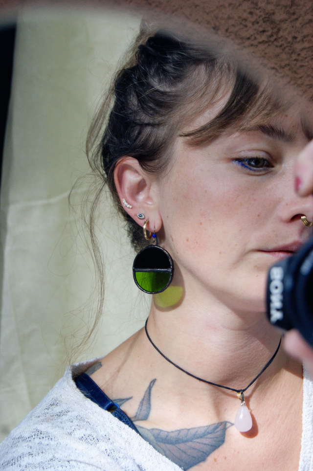 Le verre employé provient de chutes récupérées en atelier ; la fabrique de ces boucles est dans un esprit d'upcycling.