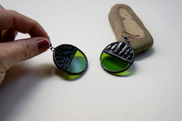 Boucles d'oreilles pendantes rondes Bicolores. Réalisées avec du vitrail, technique du vitrail Tiffany avec soudures à l'étain.