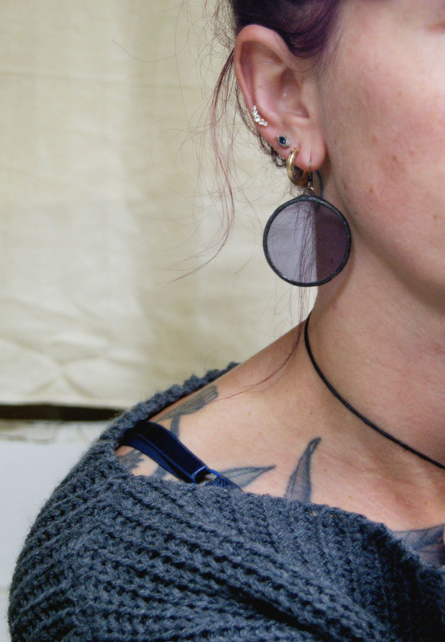 Le verre employé provient de chutes récupérées en atelier; la fabrique de ces boucles est dans un esprit d'upcycling.