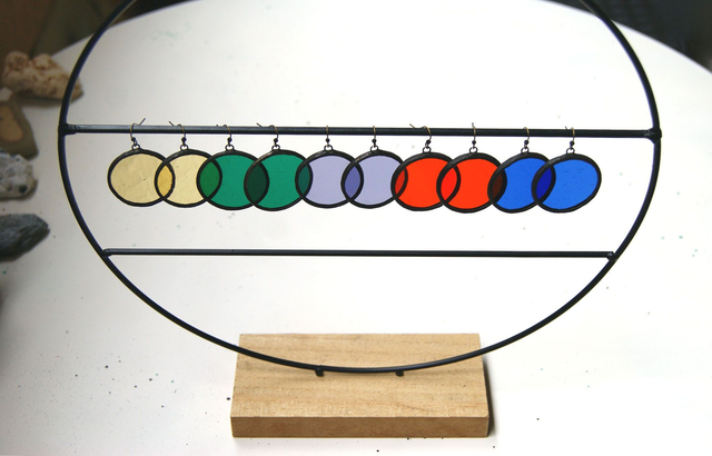 Boucles d'oreilles pendantes rondes. Bijoux fait-main, technique du vitrail Tiffany. Verre coloré et soudure à l'étain.